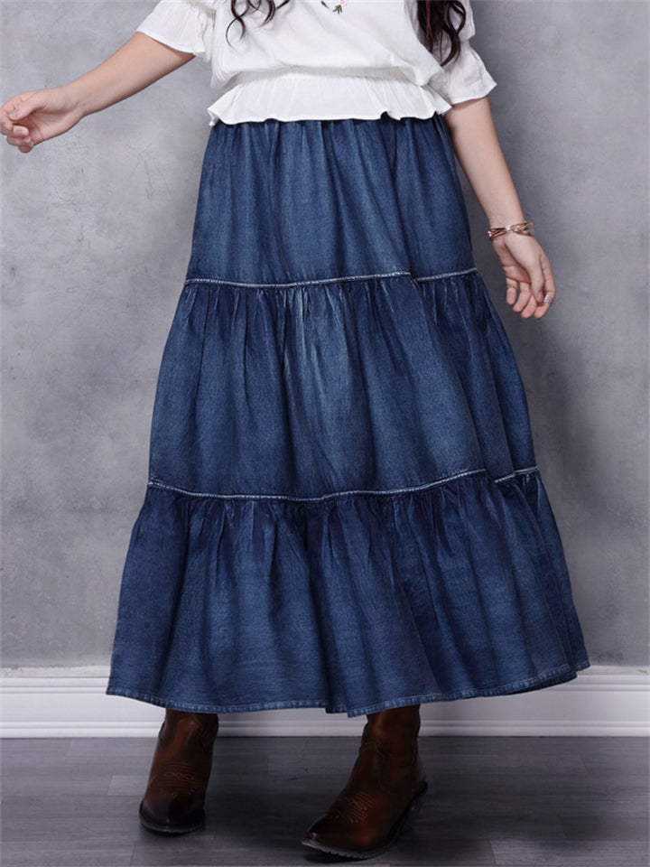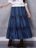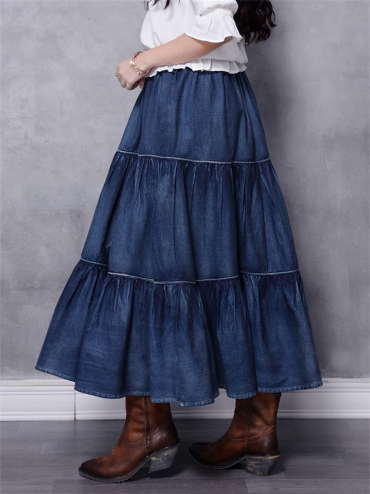 Ladies Elegant Scoop Neck High-Rise Ruffled Hem Denim Dress