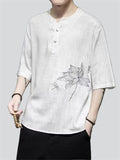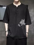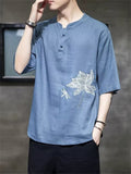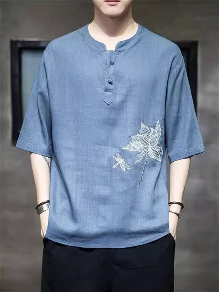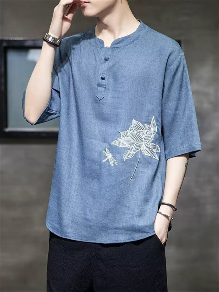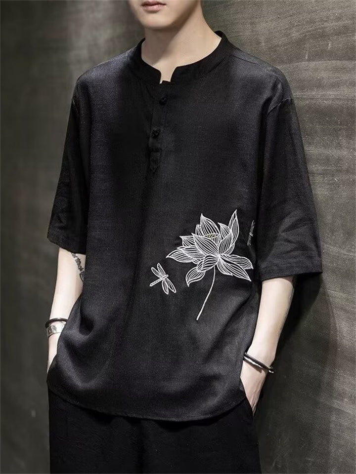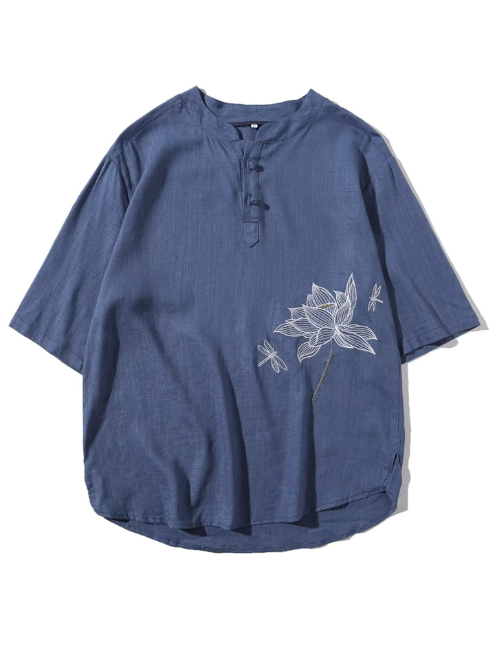 Lotus Flower Dragonfly Embroidered Men's Half Sleeve Shirts