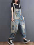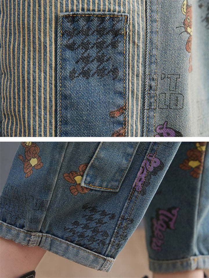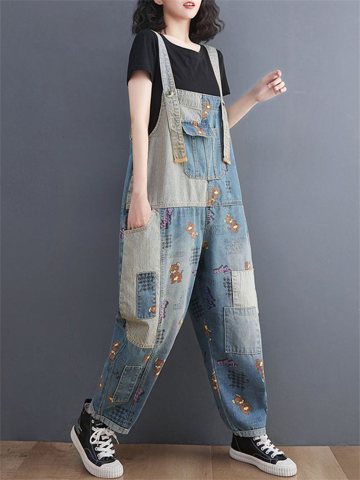 Lovely Cartoon Mouse Print Blue Denim Jumpsuit for Women