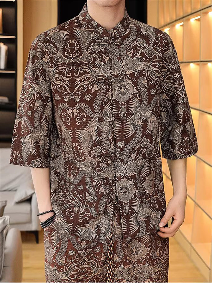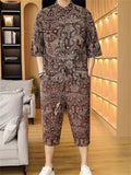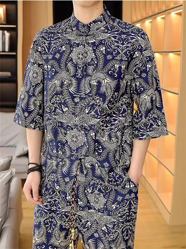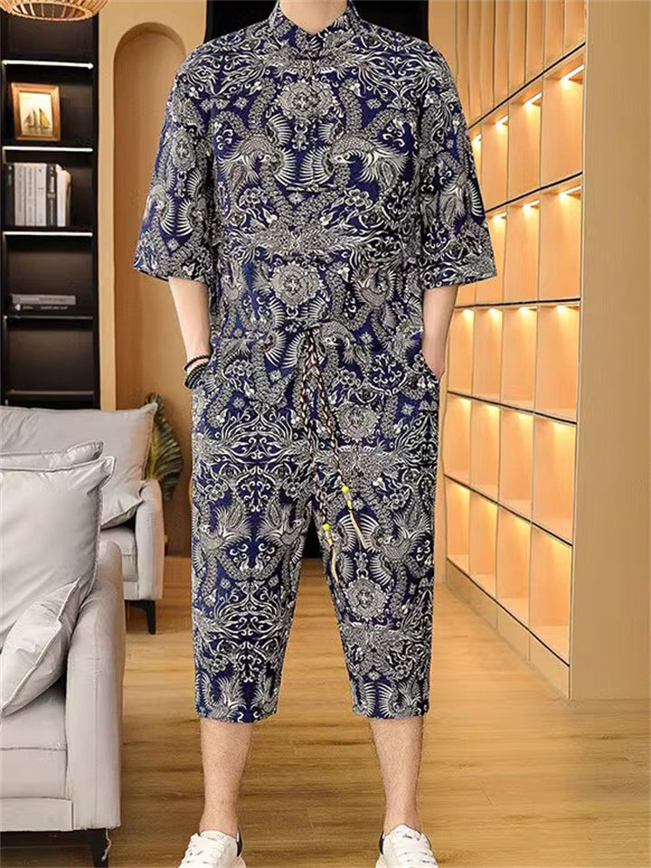 Men's 2-Piece Summer Print Half Sleeve Stand Collar Shirt& Pants Set