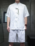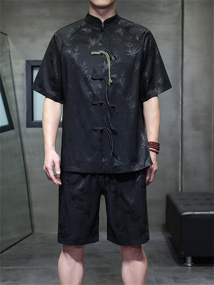 Men's 2Pcs Summer Bamboo Jacquard Stand Collar Short Sleeve Solid Color Outfits
