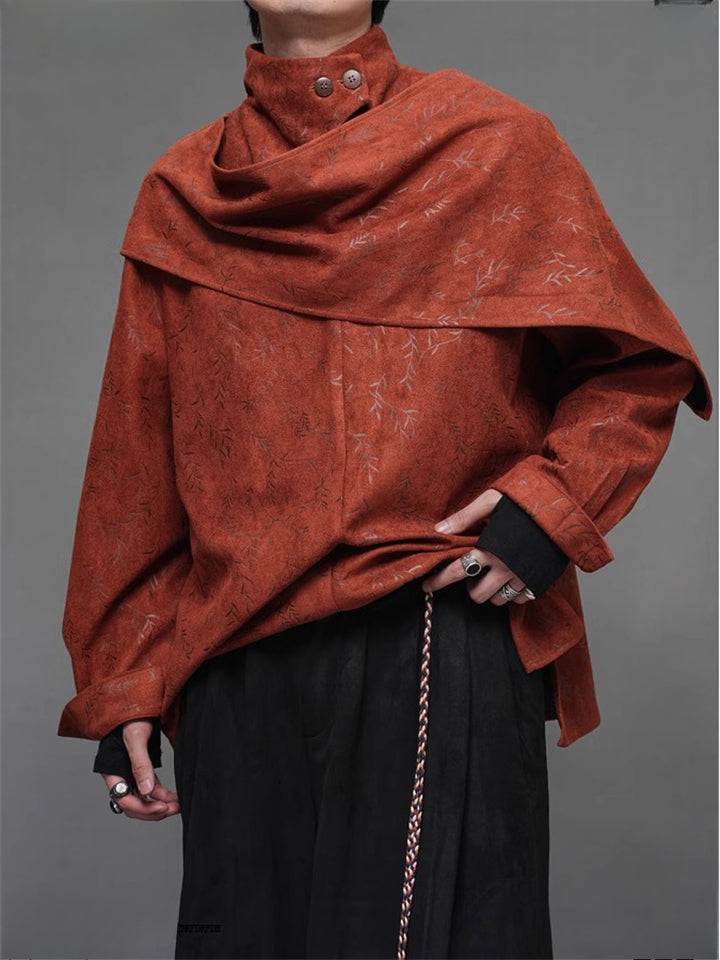 Retro Brown Print Faux Suede Long Sleeve Scarf Shirt for Men
