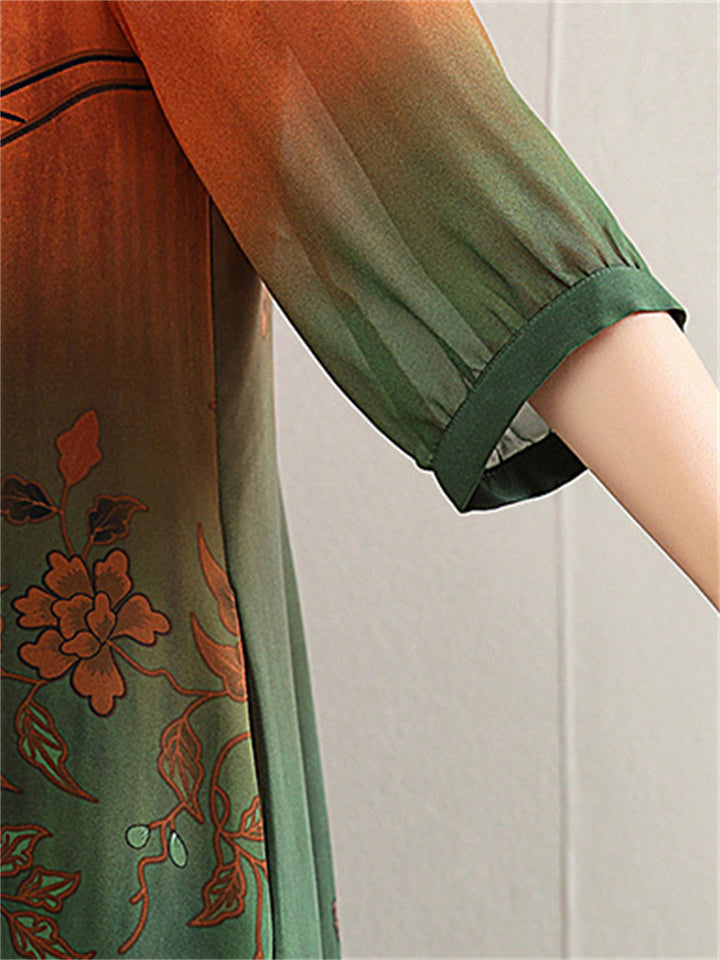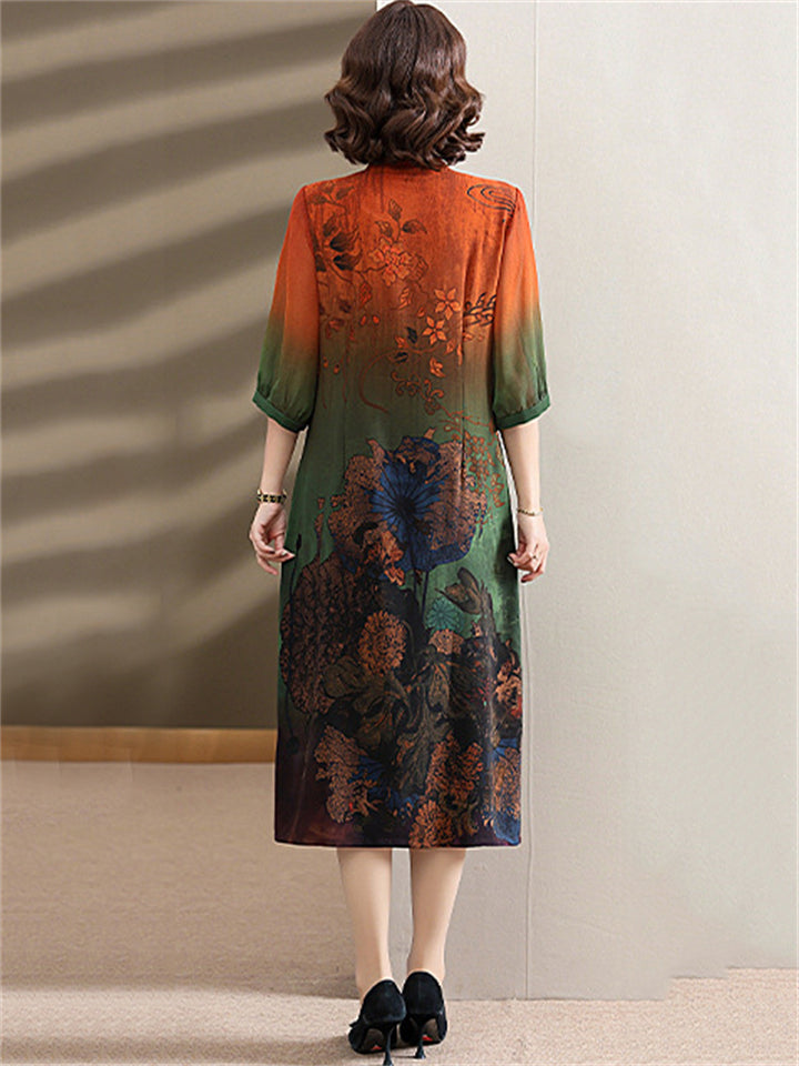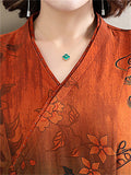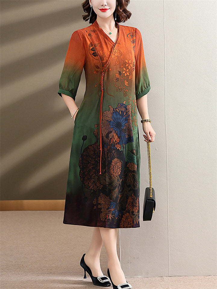 Retro Lotus Leaf Print V Neck Half Sleeve Dress for Lady