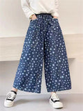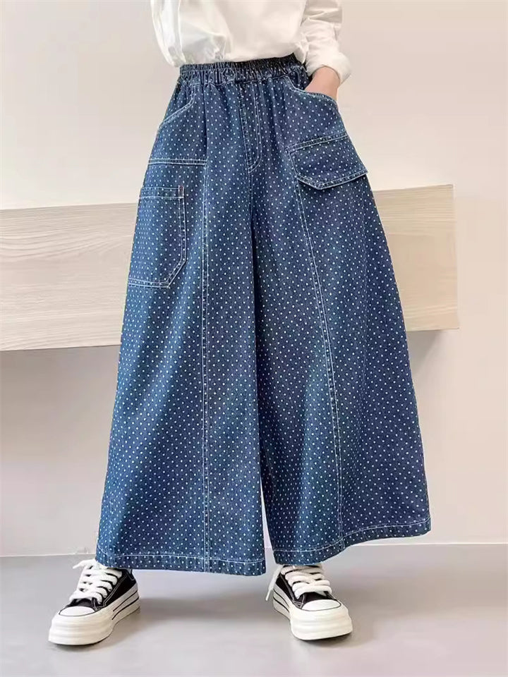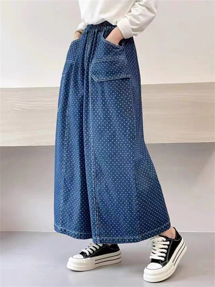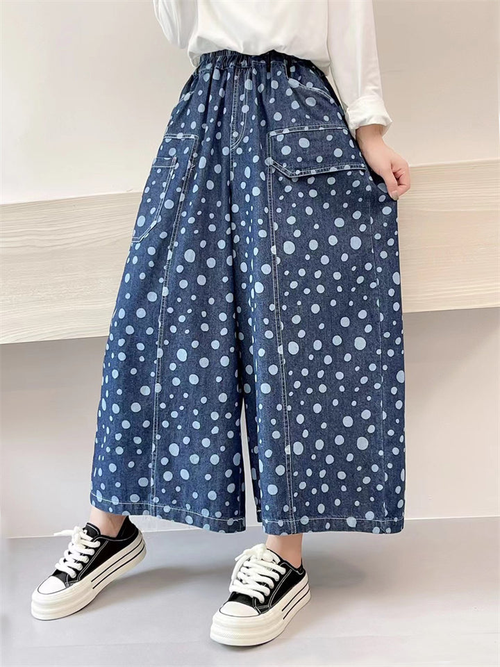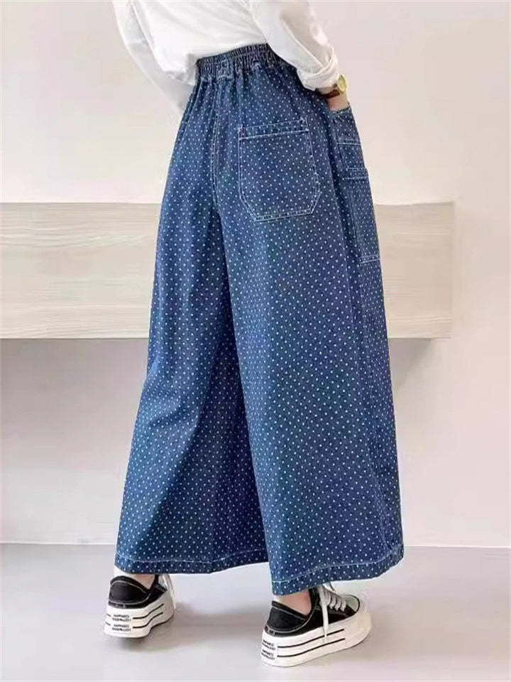 Retro Polka Dot Print Blue Wide Leg Pants for Women