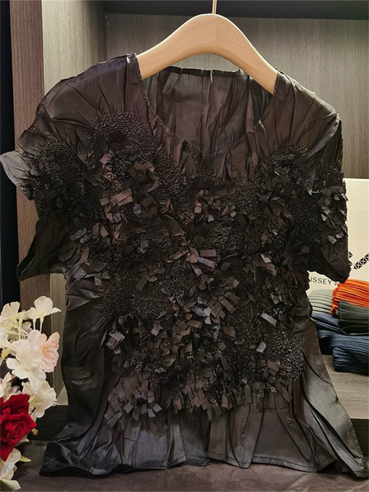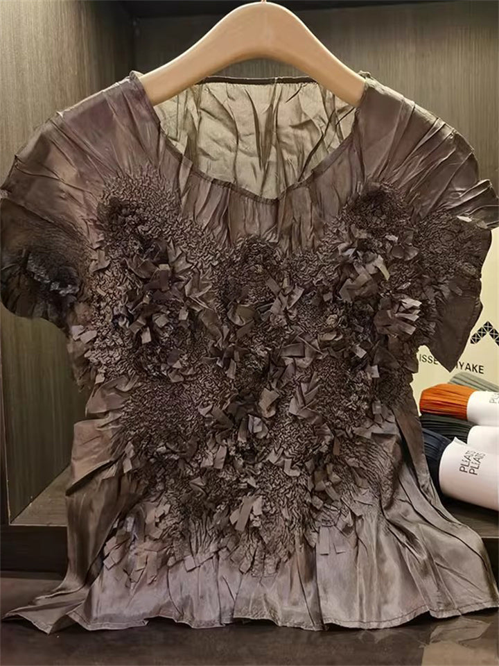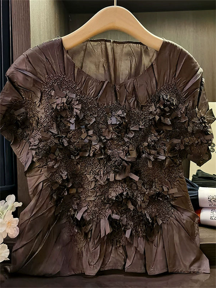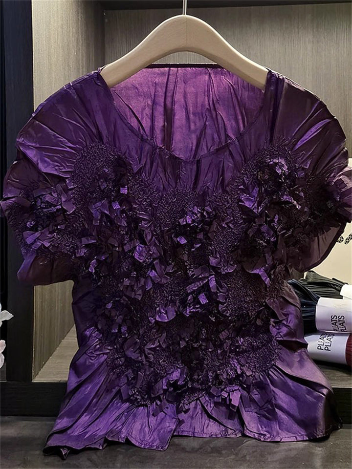 Women's Pleated Ruffle Short Sleeve Crew Neck T-shirts