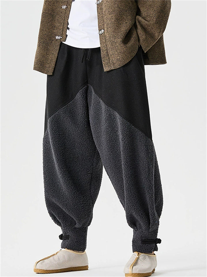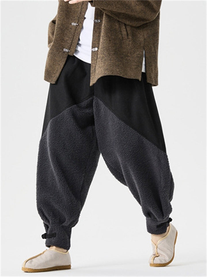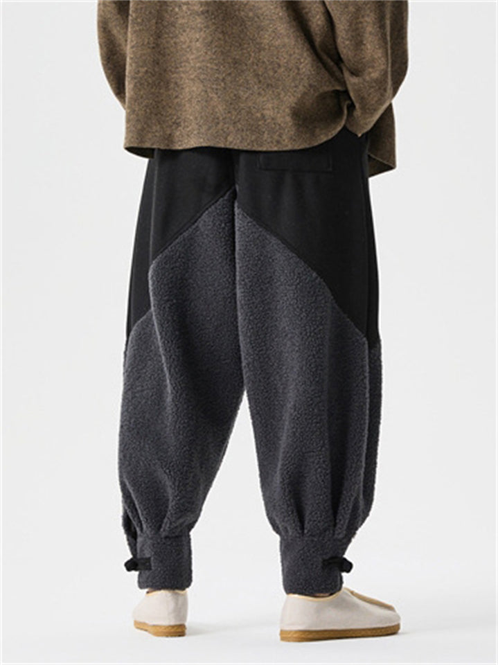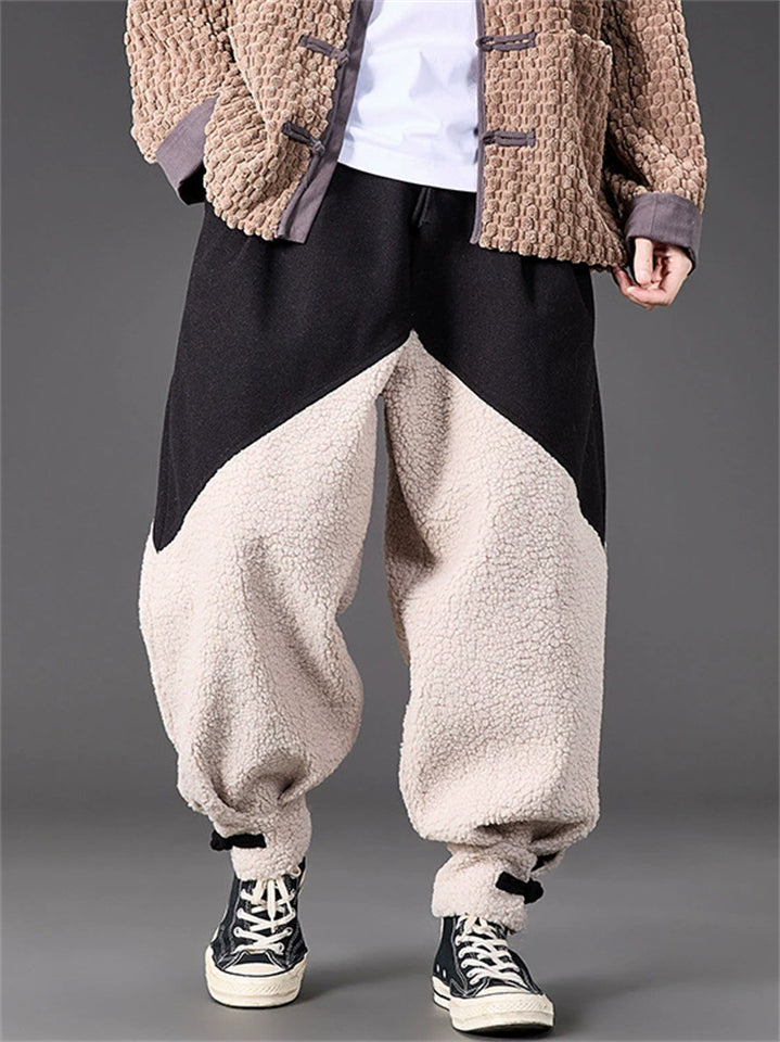 Winter Contrast Color Fleece Elastic Waist Wide Leg Jogger Pants for Men