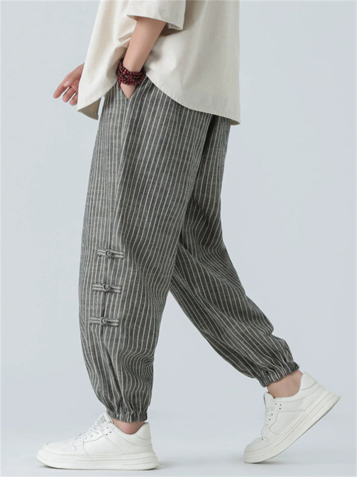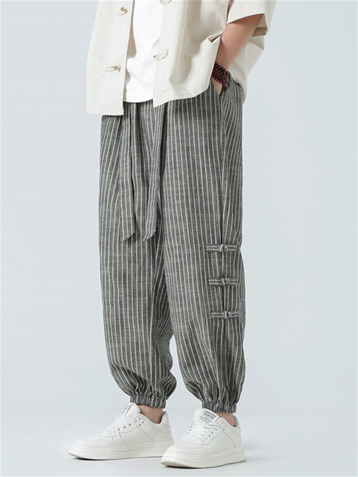 Men's Summer Casual Loose Fit Cotton Linen Jogger Pants with Frog Button Details
