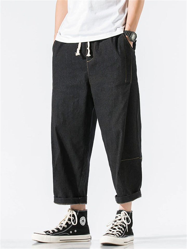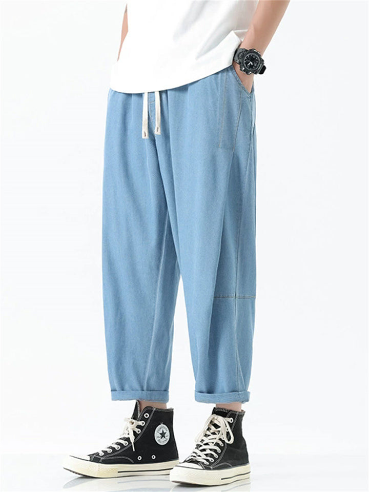 Men's Summer Casual Loose Fit Denim Cropped Pants with Drawstring Waist
