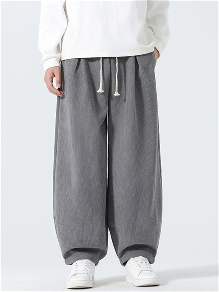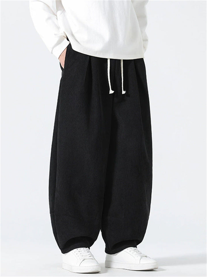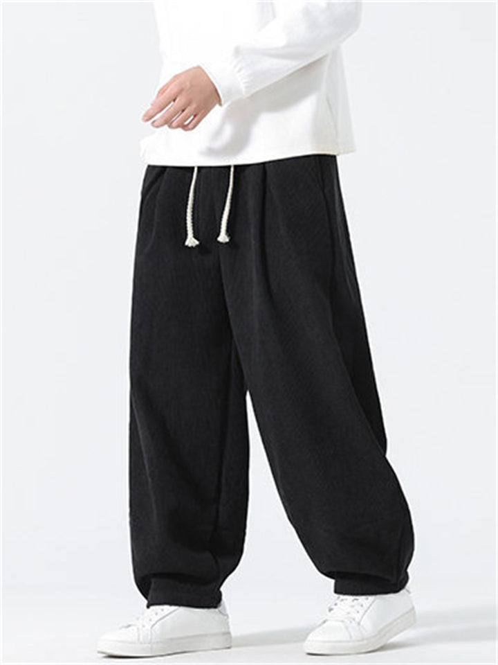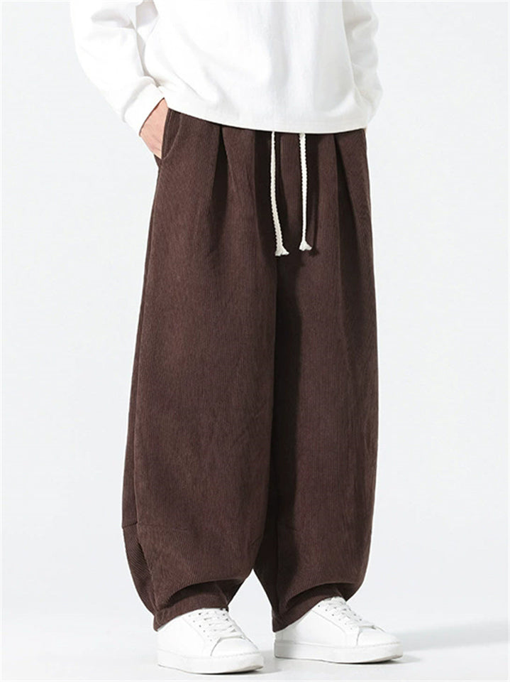 Chinese Style Drawstring Corduroy Wide Leg Pants for Men with Elastic Waist