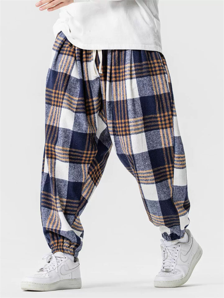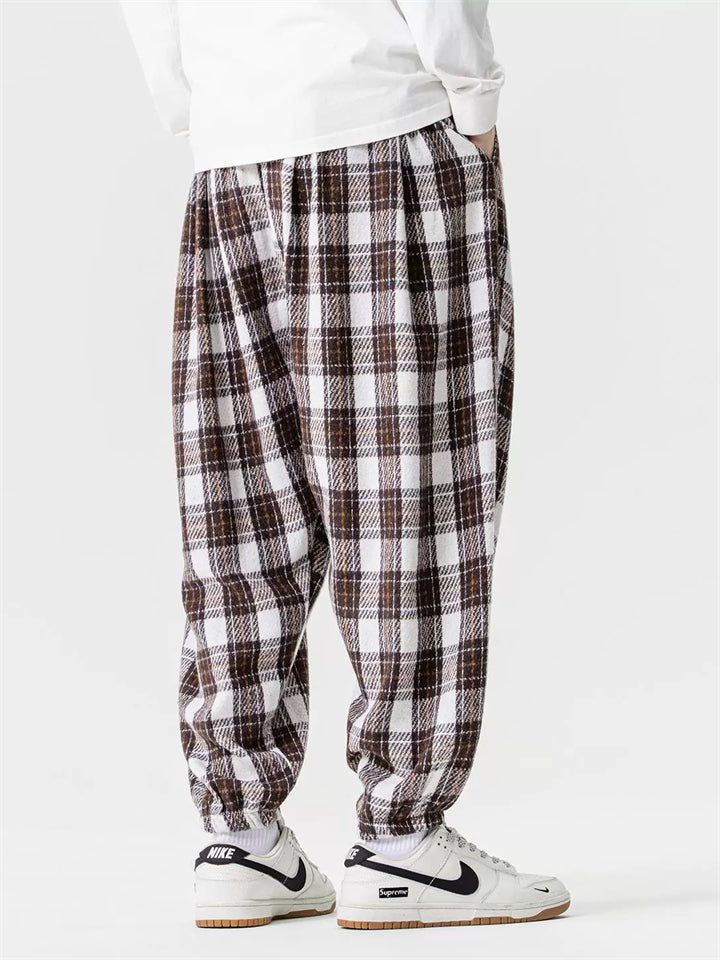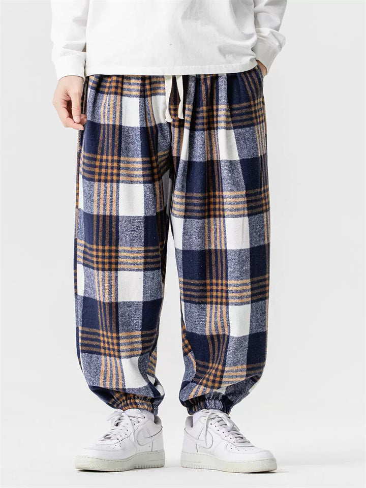 Japanese Style Autumn Plaid Drawstring Loose Jogger Pants for Men