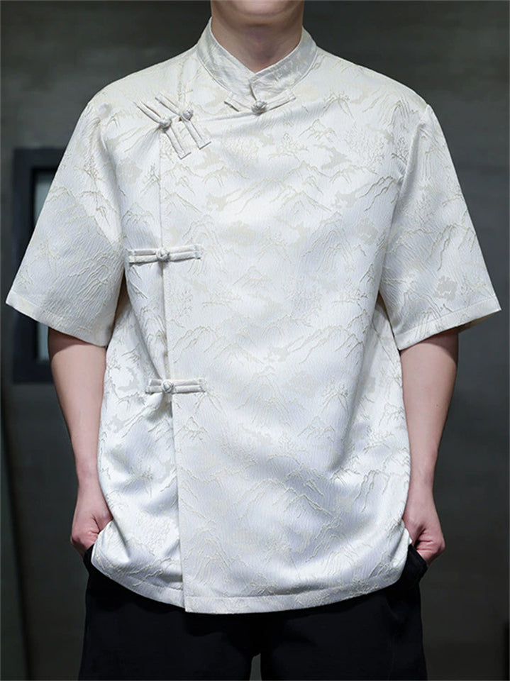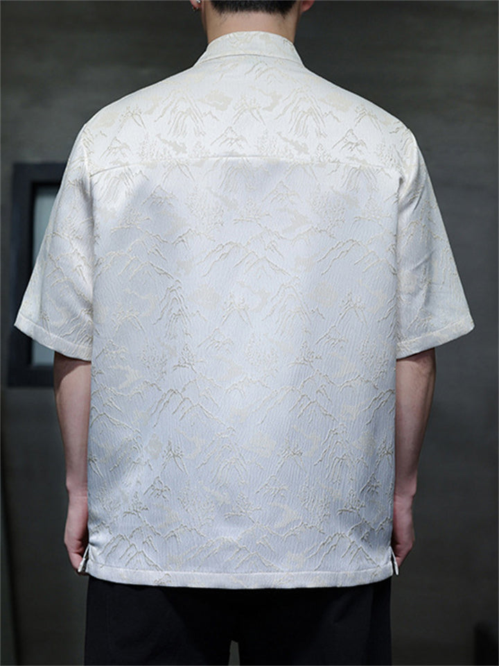Men Chinese Style Mountain Jacquard Short Sleeve Stand Collar Shirts