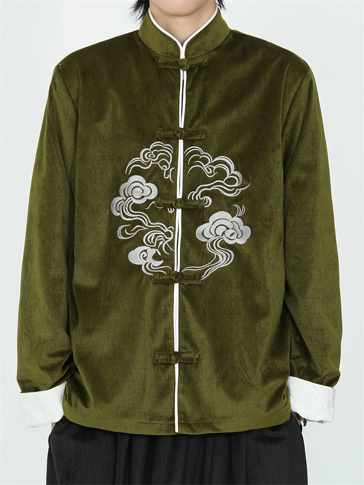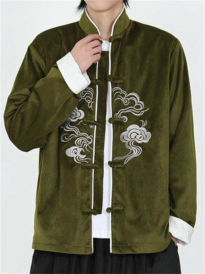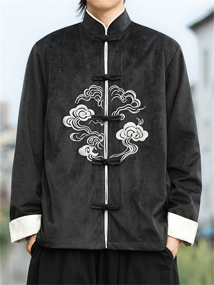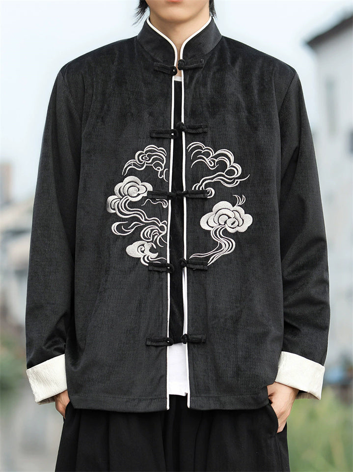 Men's Corduroy Chinese Style Jacket with Cloud Embroidery and Knot Buttons