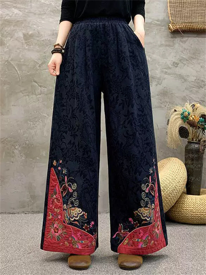 Women's Vintage Ethnic Style Flowers Embroidered Jacquard High Waist Pants