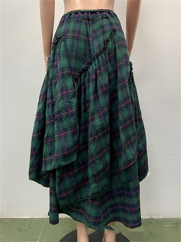 Women's Green Contrast Color Plaid Asymmetric Skirts