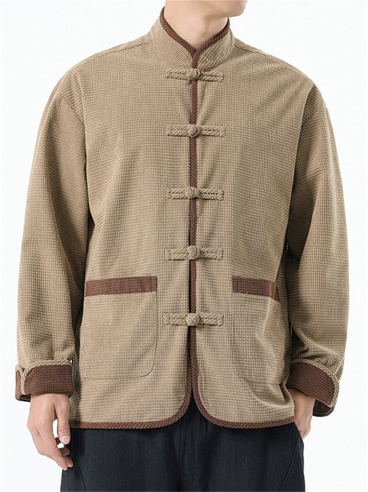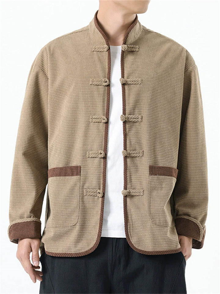Men's Corduroy Chinese Style Tang Mandarin Collar Jacket with Contrast Trim