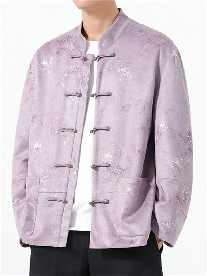 Men's Purple Chinese Style Lanscape Print Faux Suede Tangsuit Jackets