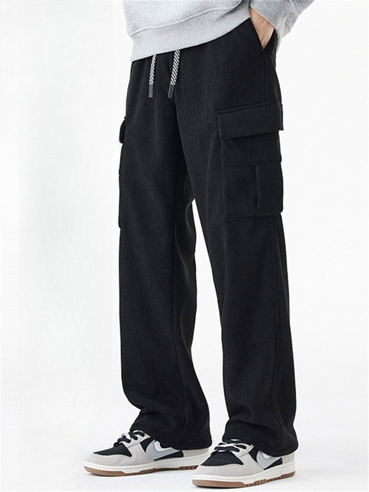 Winter Warm Fleece Lined Cargo Pocket Drawstring Men Casual Pants