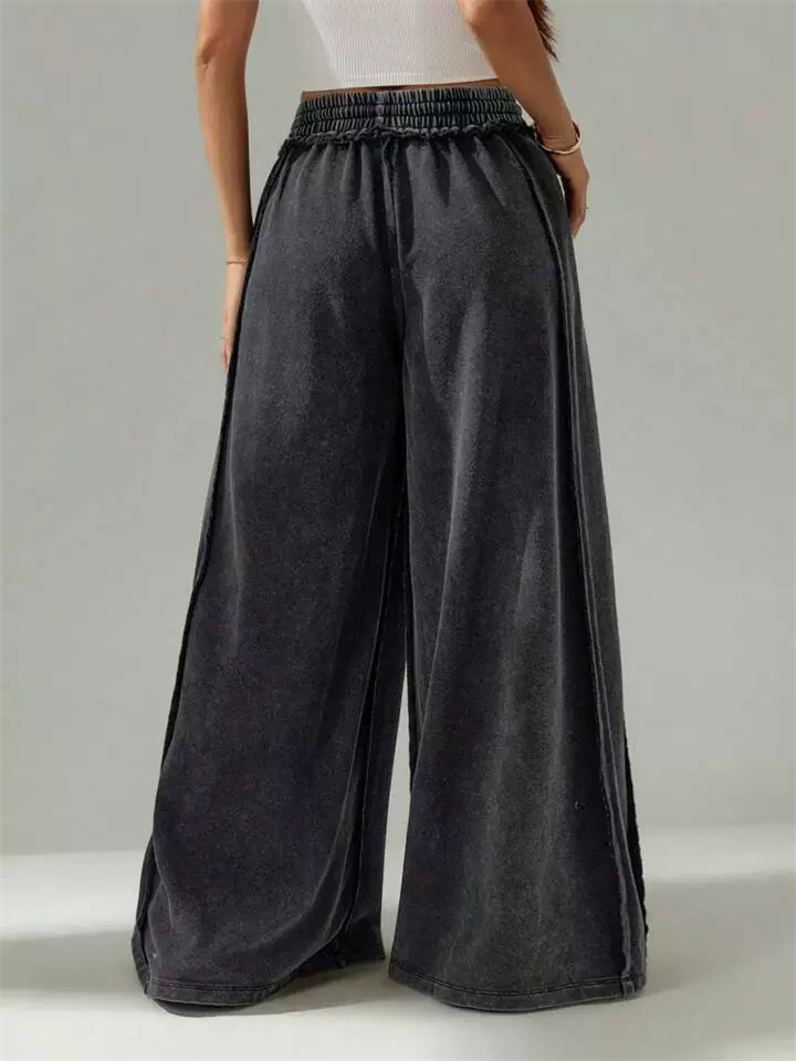 Women's Distressed Black Elastic Waist Wide Leg Long Pants